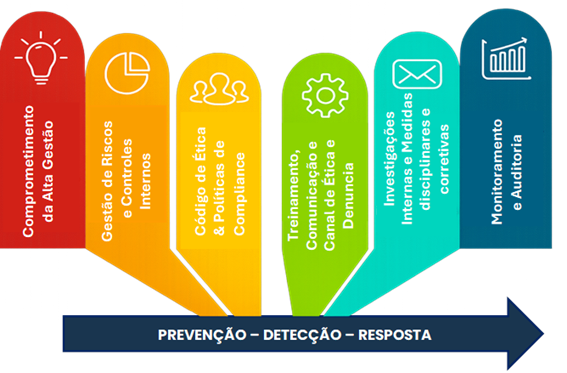 O desenho por pilares materializa o ciclo de Prevenção, Detecção e Resposta. Esse arranjo está alinhado às boas práticas internacionais (ISO 37301, ISO 37001, ISO 37002), integra-se ao dia a dia operacional (interações com agentes públicos, gestão de terceiros, LGPD) e oferece prova objetiva de conformidade ao Poder Concedente, resultando em uma governança clara, eficiente, com redução de riscos e base sólida.